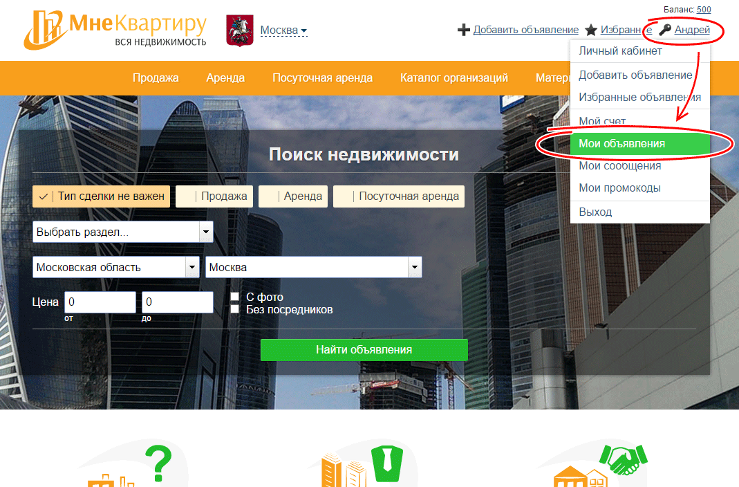 Зайдите в личный кабинет, либо на страницу "Мои объявления" с помощью меню в верхней части сайта.
