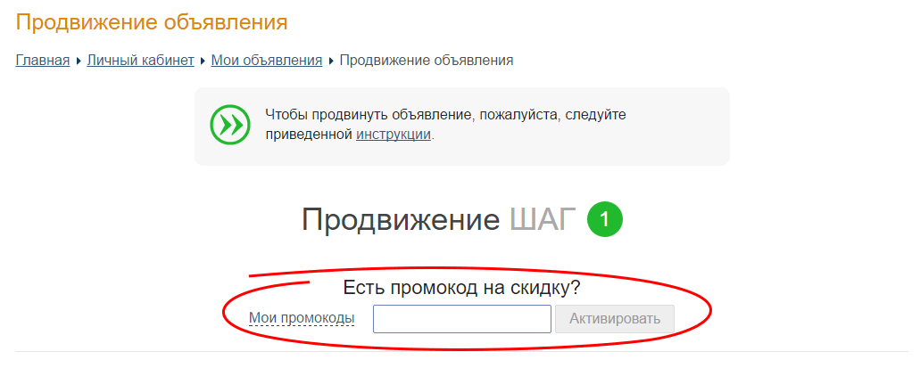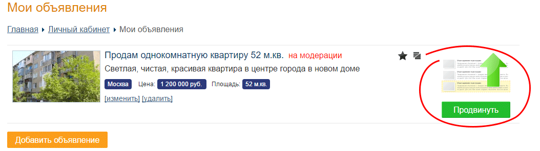 Нажмите на кнопку "Продвинуть объявление" в списке объявлений.