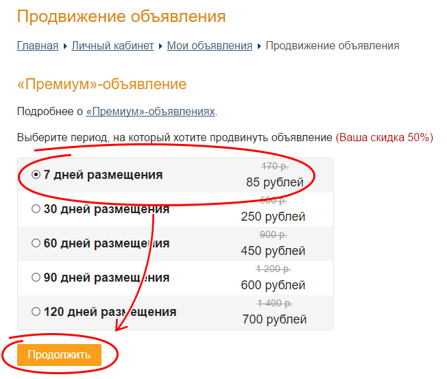 Выберите срок, на который хотите продвинуть объявление и нажмите кнопку "Продолжить".