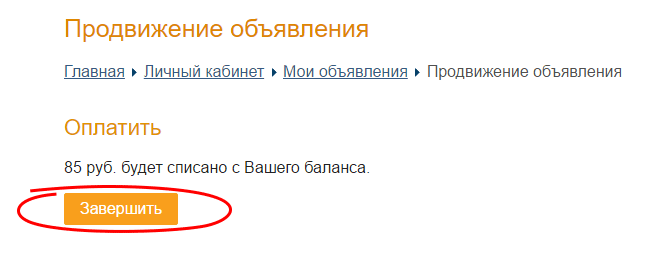 Если на Вашем балансе достаточно средств, система предложит ими воспользоваться. В таком случае, после нажатия на кнопку "Завершить", процесс продвижения будет окончен.